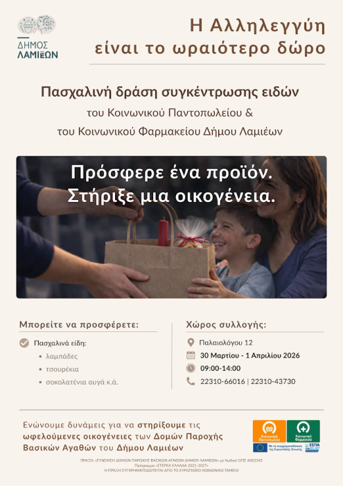 Οι Δομές Παροχής Βασικών Αγαθών του Δήμου Λαμιέων, και συγκεκριμένα το Κοινωνικό Παντοπωλείο και το Κοινωνικό Φαρμακείο, υλοποιούν πασχαλινή δράση συγκέντρωσης ειδών πρώτης ανάγκης, με στόχο την ενίσχυση οικογενειών που αντιμετωπίζουν δυσκολίες.